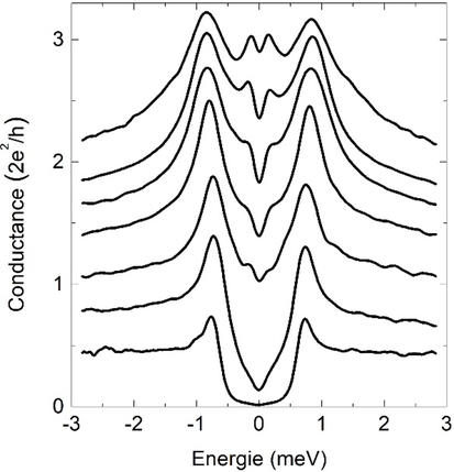 2/h, régime de réflexion d’Andreev), une paire de pics supplémentaire émerge dans les spectres à une énergie plus basse. Elle correspond à la condensation des paires de Cooper en un état collectif superfluide.