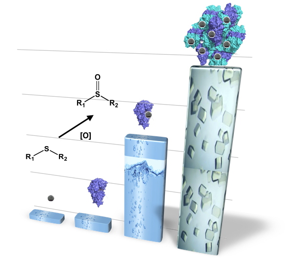 Un cristal CLEC-ArM est constitué d'hybrides NikA-FeL3 (FeL3 étant un complexe de fer avec un ligand coordinant le fer par deux atomes amines et deux pyridines) réticulés avec du glutaraldéhyde. La stabilité des cristaux dans un mélange de solvants eau-acétonitrile-1-1 permet d'utiliser de nombreux substrats lipophiles et de tester différentes réactions d'oxydation, ici la sulfoxydation.Ce travail réunit à la fois la synthèse, la catalyse et l'étude cristallographique des protéines. Il résulte d'une collaboration entre deux équipes du laboratoire Chimie et Biologie des Métaux : l'équipe Chimie Bioinspirée et Environnement et l'équipe BioCatalyse.