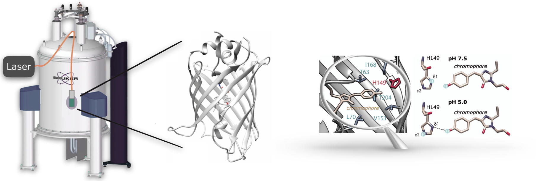 chromophore. Les populations relatives et les cinétiques d'interconversion de ces quatre états chromophoriques sont dépendantes du pH de l'échantillon et de la composition du tampon. Ceux-ci modifient en effet de manière complexe la force des liaisons hydrogène qui contribuent à stabiliser le chromophore dans l'échafaudage protéique. Les chercheurs démontrent également le rôle important que joue l'histidine en position 149 de la protéine pour stabiliser le chromophore dans sa configuration trans à certaines valeurs de pH.