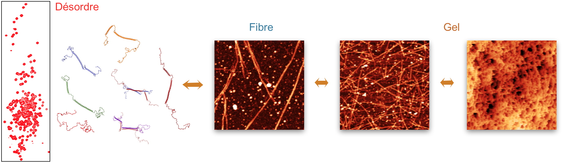 La spectroscopie RMN révèle que la protéine comprend un domaine hélicoïdal central, flanqué de terminaisons désordonnées. Après concentration de la protéine, celle-ci forme successivement des oligomères, des fibres longues et enfin des gels constitués de fibres, le tout d'une manière fortement dépendante de la température. Credit CEA
