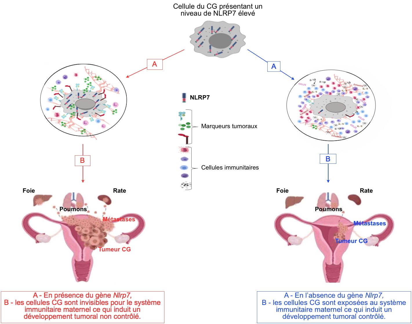 [2] que la protéine NLRP7 contribue à l’acquisition par la cellule tumorale placentaire d’un caractère immunosuppresseur lui conférant un camouflage moléculaire pour proliférer et métastaser vers le cerveau, le poumon et le foie. Afin de démontrer cette hypothèse, ils se sont posés les trois questions suivantes :