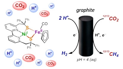 Ce que viennent de réaliser des équipes du Département de chimie moléculaire et du Laboratoire de Chimie et Biologie des Métaux à Grenoble et de l’Indian Association for the Cultivation of Science de Kolkata en synthétisant un complexe à base de nickel et de fer, directement inspiré de sites actifs de métalloenzymes impliquant ces mêmes métaux dans le métabolisme du CO2. Ce complexe s’est montré très performant pour transformer le CO2 en méthane de manière catalytique. La sélectivité de ce complexe moléculaire est unique pour cette réaction complexe, même comparée aux meilleurs matériaux catalytiques décrits jusqu'à présent. Pour améliorer encore la sélectivité de la production de méthane, les chercheurs tentent maintenant de progresser dans la compréhension du mécanisme chimique à l’origine de cette transformation.