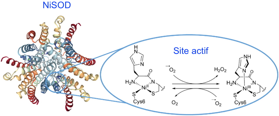 2•-, espèce réactive de l’oxygène, est un radical libre produit dans les cellules vivantes utilisant le dioxygène. Ce radical peut être toxique pour les organismes vivants en réagissant avec l’ADN ou en perturbant la production de protéines. Pour détruire le superoxyde, les superoxydes dismutases (SOD) sont des métalloenzymes qui catalysent sa dismutation au niveau de leur site actif à base d’ions métalliques (Fe, Mn, Cu, Zn). Des études récentes s’intéressent à une SOD bactérienne dont le site actif possède un ion nickel, la NiSOD. La compréhension du mécanisme catalytique de la NiSOD et l’optimisation de complexes bio-inspirés de cette enzyme pourraient permettre de concevoir de nouvelles thérapies contre les maladies liées au stress oxydant, comme les maladies inflammatoires chroniques de l’intestin.