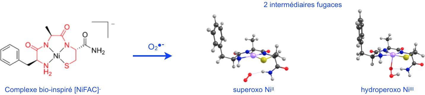 Figure 2). Les résultats, dans les conditions physiologiques (eau, pH 7), montrent une activité catalytique de ce complexe de type SOD. En dépit de leur courte durée de vie et de leur faible concentration, les chercheurs sont parvenus à identifier en solvant organique et à basse température, deux intermédiaires réactionnels instables : les complexes superoxo Ni