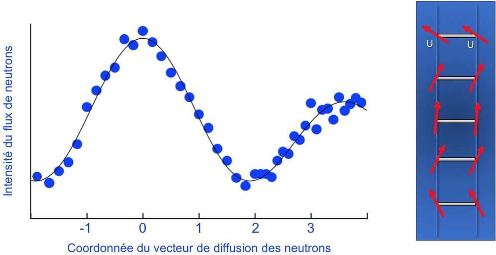 Figure : Spectre de la diffusion des neutrons dans UTe2. Les fluctuations magnétiques décrivent une courbe sinusoïdale. Le maximum de la courbe est dû au couplage ferromagnétique des atomes d’uranium (flèches rouges : moment magnétique) qui forment les barreaux d'une échelle.