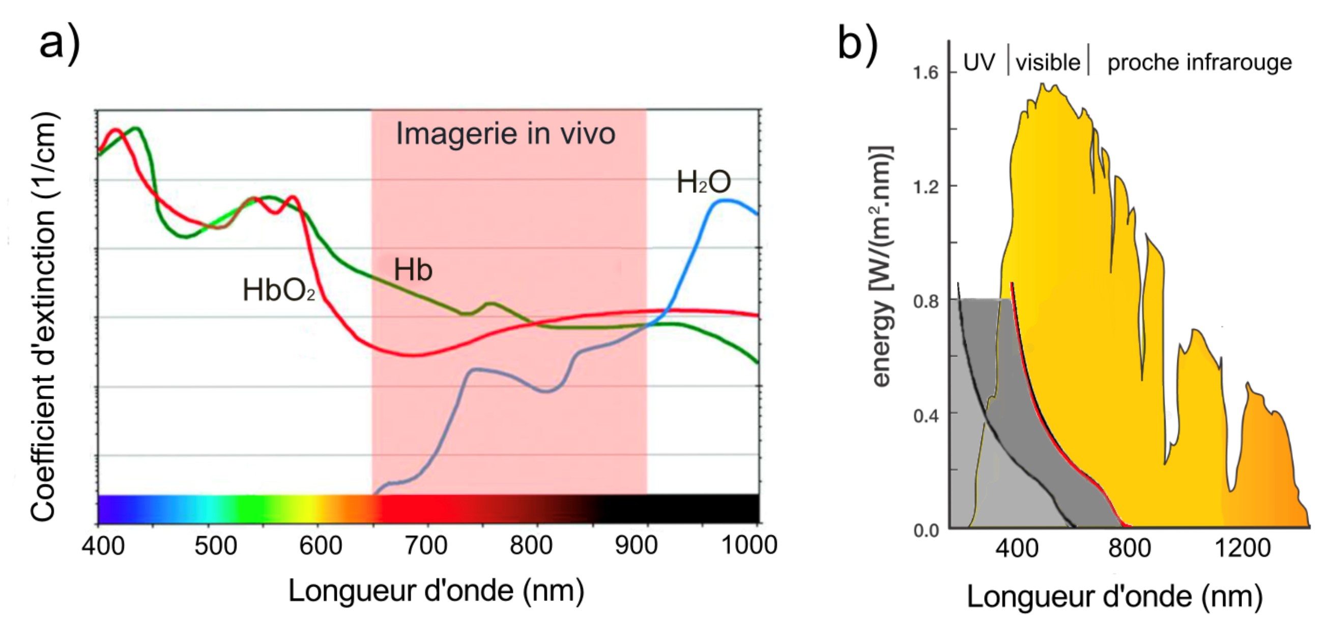 in vivo, l’infrarouge augmente le rapport signal sur bruit, en minimisant l’absorption et la diffusion par le milieu biologique (Fig. a), afin d’effectuer une analyse plus en profondeur.