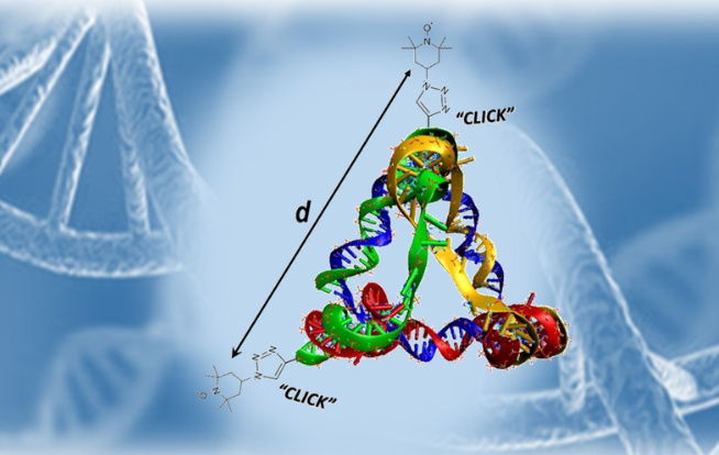 plateforme BIOMade de l'Irig, les chercheurs ont synthétisé et assemblé des nanostructures tétraèdriques d’ADN qui ont été marquées précisément par deux sondes radicalaires sur les sommets sélectionnés en utilisant la « Chimie Click » (voir Figure). En effet, cette méthode de bio-conjugaison s’opère dans des conditions douces, ne forme pas de sous-produit, et présente une importante sélectivité ainsi qu’un haut rendement de réaction.