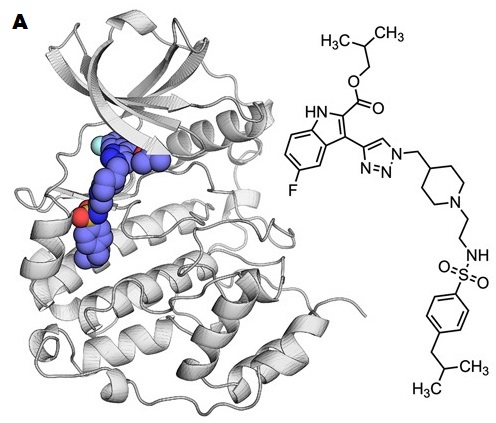 Les chercheurs de l’Irig et de la Faculté de Pharmacie de Lyon ont réussi à synthétiser et à caractériser la molécule AB668 qui inhibe l’activité de CK2 avec une grande spécificité. En effet, cette molécule bivalente se fixe simultanément sur le site catalytique de la CK2 et sur une poche hydrophobique adjacente, ce qui lui confère un mécanisme d’inhibition unique (Figure 1A).