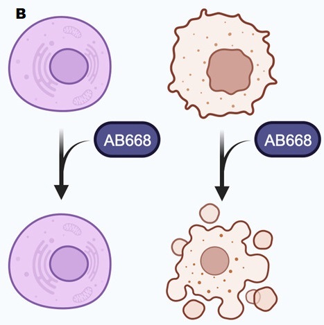 De plus, la molécule AB668 ne présente pas d’effets secondaires défavorables car elle induit la mort par apoptose de nombreuses lignées cellulaires dérivées de cancers agressifs (rein, sein, mélanome, pancréas, colon), tout en épargnant les cellules saines (Figure 1 B).