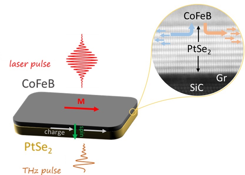 Cependant, deux obstacles freinent le développement de telles sources THz : la fabrication de matériaux 2D sur de grandes surfaces, et le contrôle de l’interface entre le matériau 2D et l’électrode ferromagnétique. En effet, les matériaux 2D de laboratoire sont généralement de taille réduite car presque exclusivement réalisés à partir de flocons micrométriques exfoliés mécaniquement d’un matériau massif. De plus, l’interface entre le matériau 2D et le matériau ferromagnétique, source du courant de spin, n’est pas bien définie : la croissance de l'électrode ferromagnétique sur le matériau 2D entraîne des réactions chimiques d’interface et de l’interdiffusion atomique. Cependant, les chercheurs sont parvenus à dépasser ces deux obstacles pour étudier les mécanismes de conversion spin-charge dans le diséléniure de platine PtSe2.