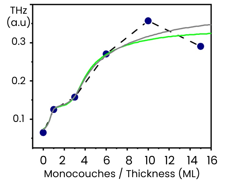 Figure 2 : Mesures de l'intensité du champ électrique THz émis en fonction de l’épaisseur (en nombre de monocouches ou ML) de PtSe2 montrant deux régimes de conversion aux faibles épaisseurs (< 4ML) et fortes épaisseurs (> 4ML). Les points bleus correspondent aux mesures et les courbes en trait plein à des ajustements théoriques. Crédit CEA