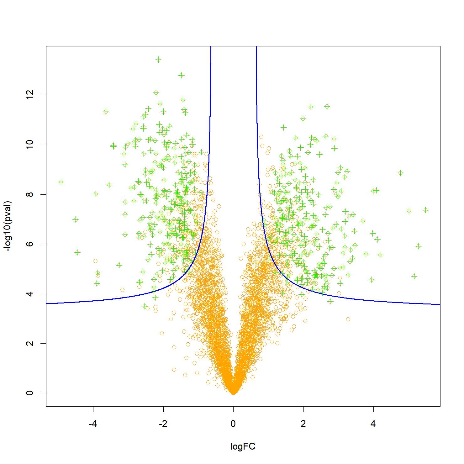 Figure : Un « volcano-plot » typique, représentant par des points oranges les protéines analysées, et pouvant potentiellement expliquer une différence de phénotype (par exemple sain ou malade) en fonction de leur significativité (en ordonnée) et de l’importance de l’effet mesuré (en abscisse). Les biomarqueurs candidats les plus pertinents sont généralement situés près des deux coins supérieurs, mais certains peuvent se trouver plus bas et au milieu, ce qui complique la sélection. Les filtres Knockoffs permettent de contrôler le taux de fausses découvertes associé à une sélection des protéines (en vert) suivant une frontière de décision plus flexible, notamment hyperbolique (représentée ici en bleu) ce qui permet de tenir compte à la fois de l’effet et de la significativité. Crédit CEA
