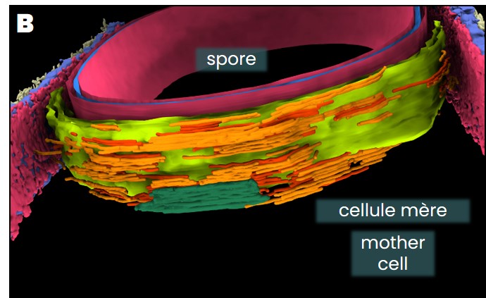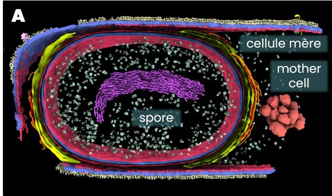 Image B, les couches naissantes du manteau protéique de la spore sont colorées en jaune, orange, rouge et vert foncé. Credit CEA