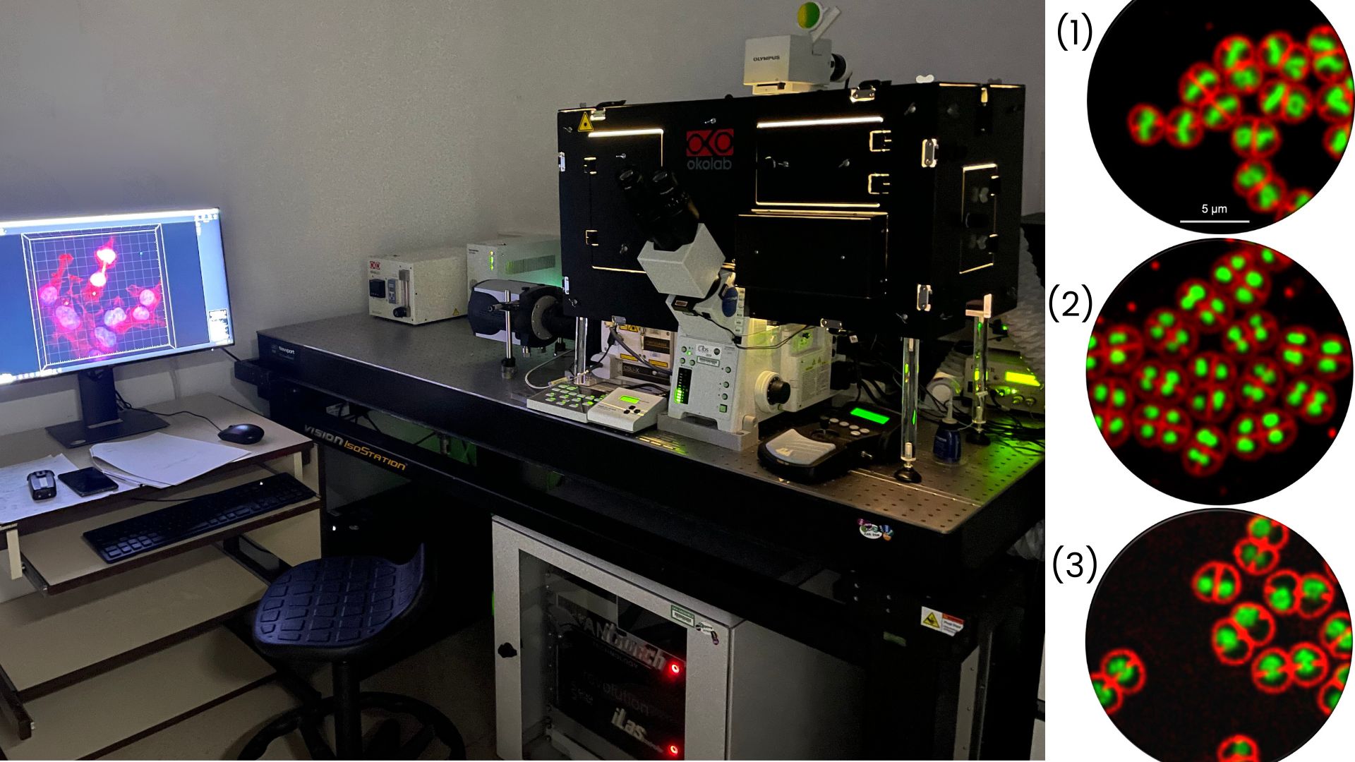 Figure : photo du microscope. A droite, en incrustation marquages du nucléoïde en vert et de la membrane en rouge © CEA :