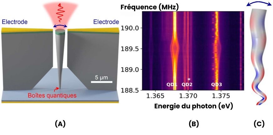 En collaboration avec des collègues de l'Institut Néel (Grenoble) et du laboratoire Lumin (Orsay) l’équipe a conçu un dispositif basé sur un microfil vibrant en arséniure de gallium contenant une boîte quantique en arséniure d’indium. Une boîte quantique est une nanostructure semiconductrice qui se comporte comme un atome. Elle présente en effet des niveaux d’énergie discrets et des propriétés optiques remarquables à température cryogénique. De plus, l’énergie de bande interdite d’un matériau semiconducteur est très sensible à la déformation du réseau cristallin. Ce mécanisme très simple couple fortement la longueur d’onde d’émission de la boîte quantique au déplacement du microfil. Les premières études ont exploité le mode de vibration fondamental du microfil, qui résonne en dessous du mégahertz et se comporte comme un oscillateur classique. Pour atteindre le régime quantique, il est nécessaire d’augmenter considérablement la fréquence mécanique, afin de minimiser l’impact du bruit thermique. En outre, ceci permettra un contrôle et une détection tout-optique du mouvement mécanique.