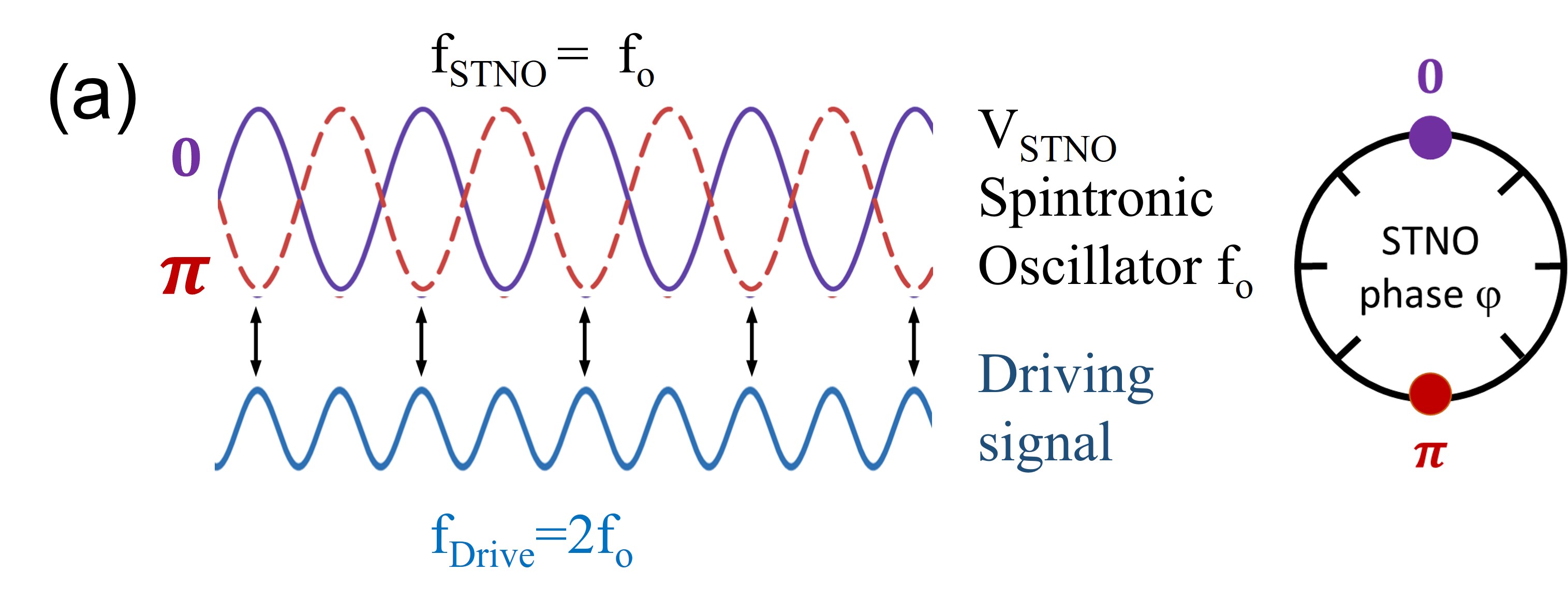 Figure : (a) Illustration de la binarisation de la phase par une synchronisation à une source externe. La phase de l’oscillateur s’adapte à celle du signal externe (Drive).