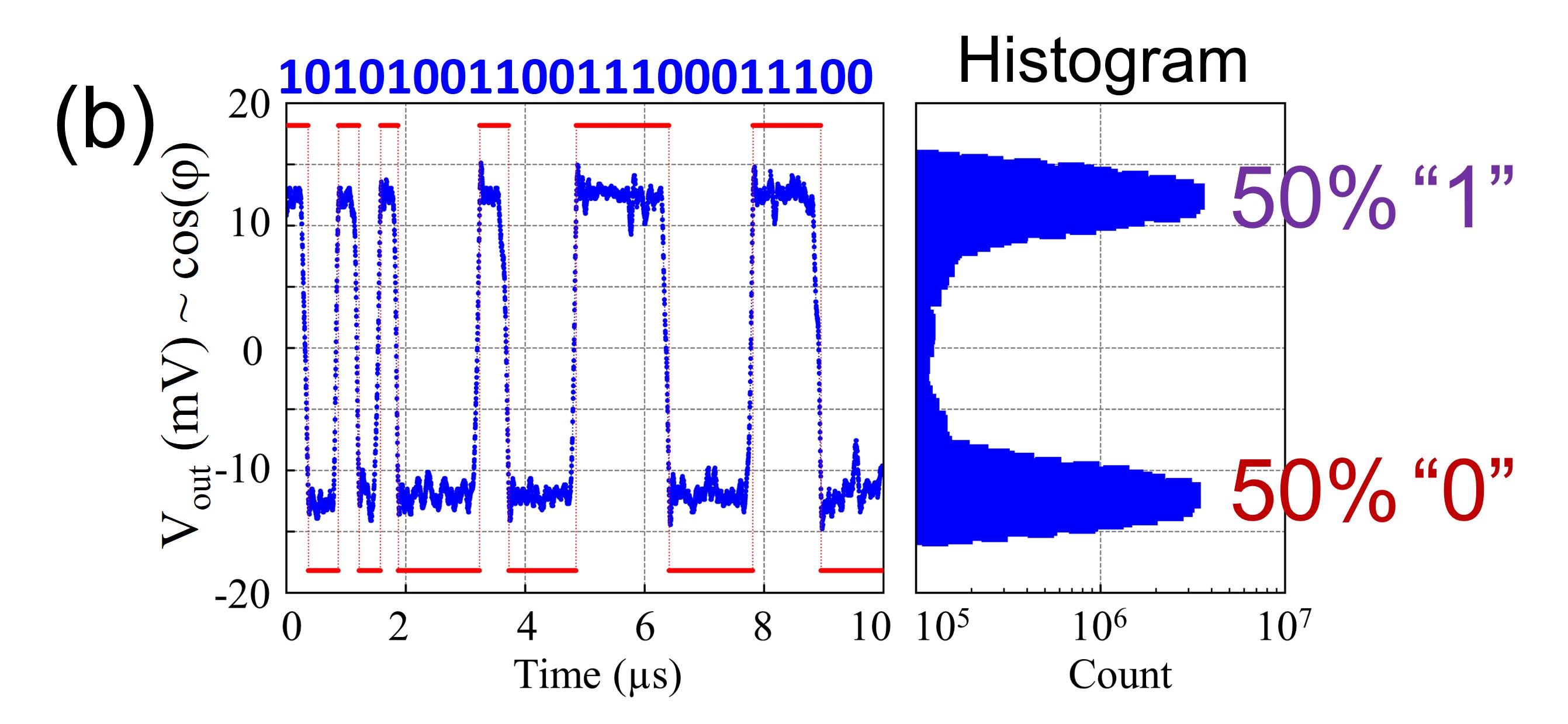 Des chercheurs du laboratoire CEA-Irig/Spintec ont validé un concept pour générer un flux binaire aléatoire et intrinsèquement non-biaisé, basé sur la dynamique stochastique de la phase d’un nano-oscillateur spintronique. Lorsque l’oscillateur est synchronisé à un signal externe, avec une fréquence double par rapport à la sienne, alors sa phase se stabilise sur deux valeurs discrètes, multiples de Pi (cf.