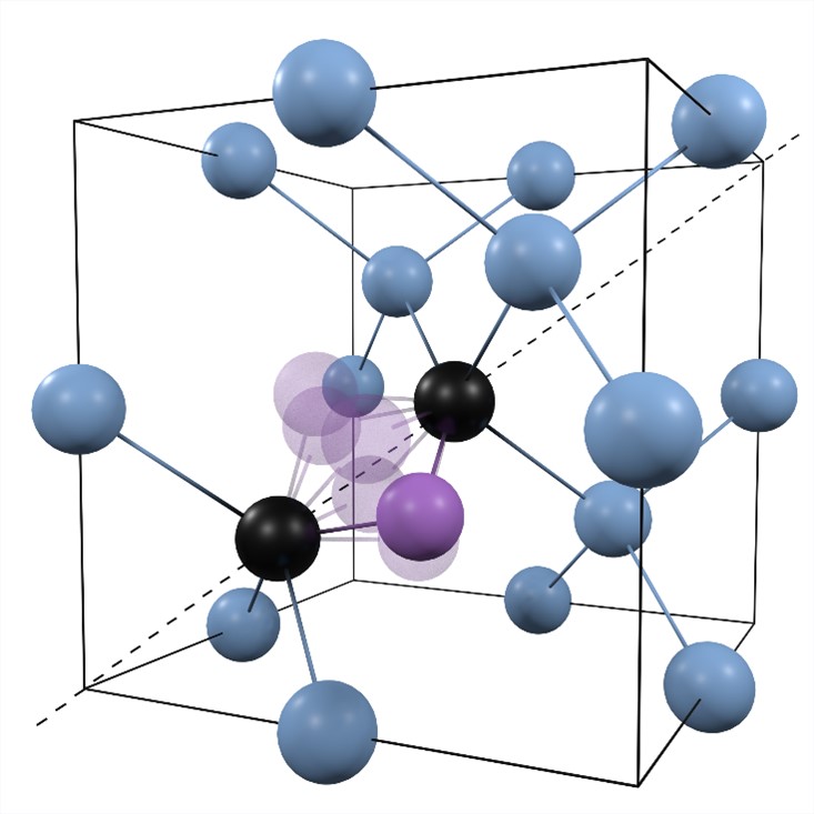 Figure : Vue d'un centre G mobile. Les boules bleues représentent les atomes de Si et les boules noires les atomes de carbone en position de substitution. La boule violette est un atome interstitiel de Si qui saute entre six sites de réseau différents.