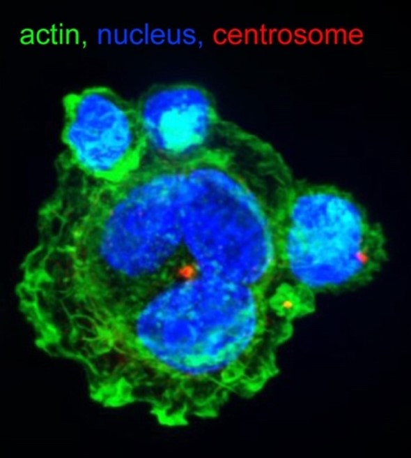 Observation par microscopie confocale des composants de l'architecture cellulaire : l'orientation de l' axe de polarité des cellules est révélée par la position du centrosome (en rouge).
