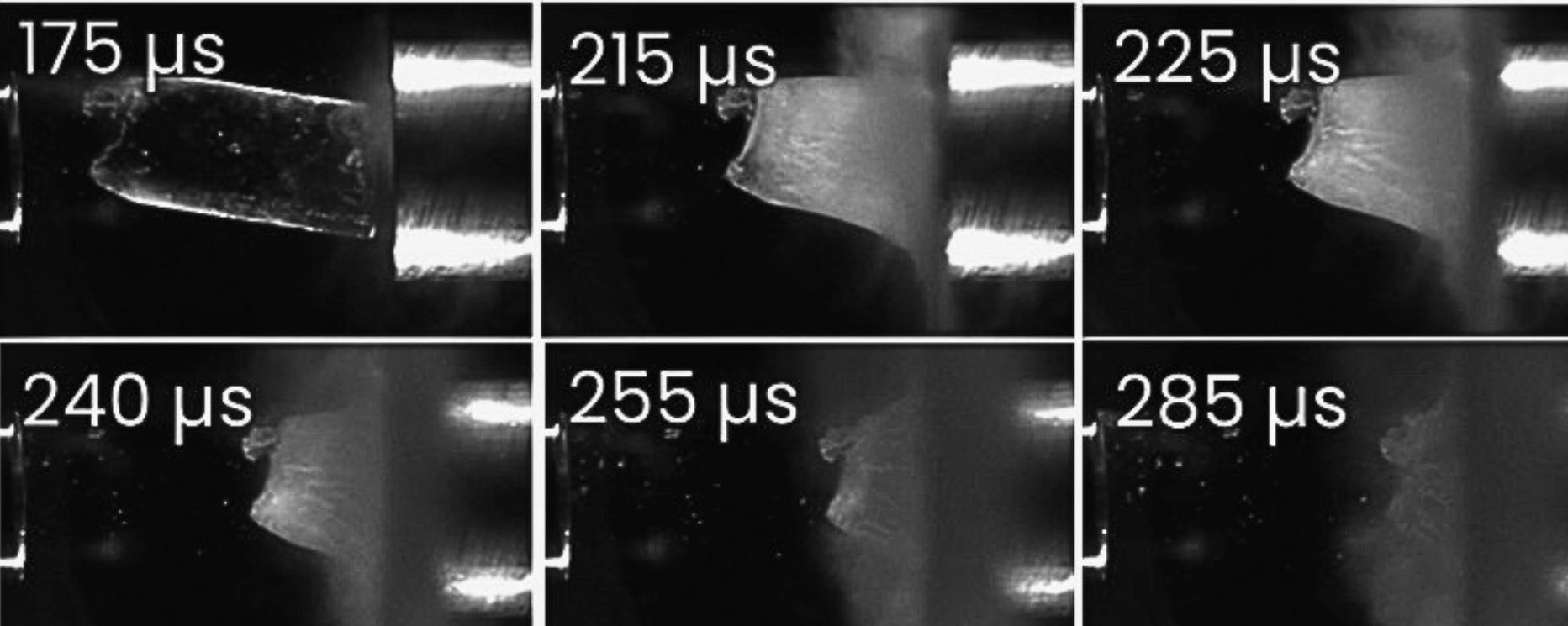 Figure 1 : Images séquentielles de l’impact d’un glaçon d’hydrogène solide à 500m/s