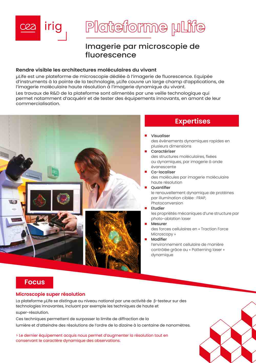 Les développements récents en imagerie visent à observer en temps réel la dynamique de l’ensemble des molécules impliquées dans un processus cellulaire donné. Afin de répondre à ces besoins, notre institut a mutualisé un ensemble d’équipements pour l’imagerie cellulaire et moléculaire autour d’une plate-forme qui a pour vocation de permettre à chaque utilisateur de bénéficier de la technique d’imagerie adaptée à la problématique scientifique posée. En plus de deux microscopes confocaux « classiques » préexistants, la plate-forme μLiFe a été équipée d’un nombre limité d’équipements de très haute technologie afin d’étudier le fonctionnement de la cellule au niveau moléculaire, avec un focus particulier sur l’étude de la localisation dynamique des protéines.