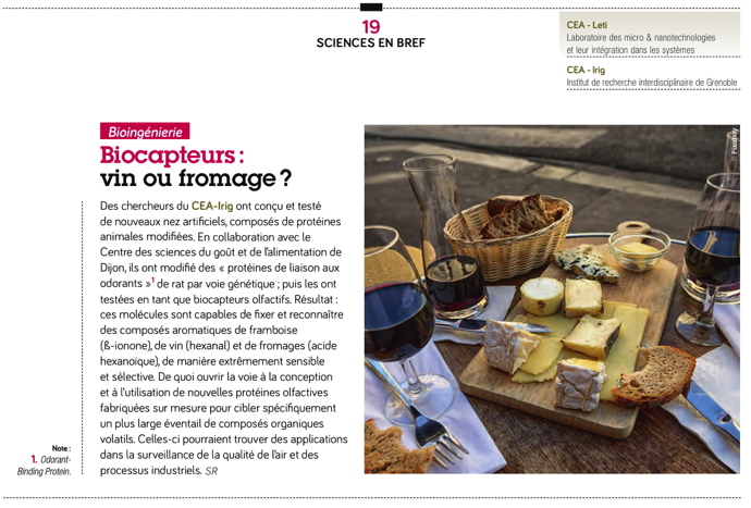 Des chercheurs du CEA-Irig ont conçu et testé de nouveaux nez artificiels, composés de protéines animales modifiées. En collaboration avec le Centre des sciences du goût et de l’alimentation de Dijon, ils ont modifié des « protéines de liaison aux odorants 1 de rat par voie génétique ; puis les ont testées en tant que biocapteurs olfactifs. Résultat : ces molécules sont capables de fixer et reconnaître des composés aromatiques de framboise (ß-ionone), de vin (hexanal) et de fromages (acide hexanoïque), de manière extrêmement sensible et sélective. De quoi ouvrir la voie à la conception et à l’utilisation de nouvelles protéines olfactives fabriquées sur mesure pour cibler spécifiquement un plus large éventail de composés organiques volatils. Celles-ci pourraient trouver des applications dans la surveillance de la qualité de l’air et des processus industriels.