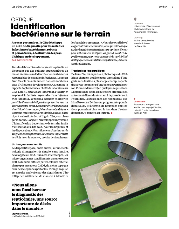 De leur côté, les experts en photonique du laboratoire Pheliqs du CEA-Irig se chargent de développer un système d’imagerie sans lentille à plus large champ, capable d’analyser le contenu d’une boîte de Pétri (d’environ 10 cm de diamètre) en quelques acquisitions. L’appareillage devra en outre être « tropicalisé », autrement dit rendu résistant à la poussière et à l’humidité. Les tests dans des hôpitaux au Burkina Faso et au Bénin sont programmés pour le début 2023. Et à terme, de nouvelles applications pourraient bien voir le jour dans d'autres domaines, y compris en Europe.