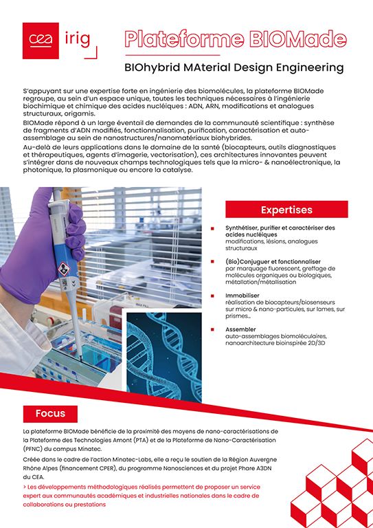 BioMade répond à un large éventail de demandes de la communauté scientifique : synthèse de fragments d’ADN modifiés, fonctionnalisation, purification, caractérisation et auto-assemblage au sein de nanostructures/nanomatériaux biohybrides.
