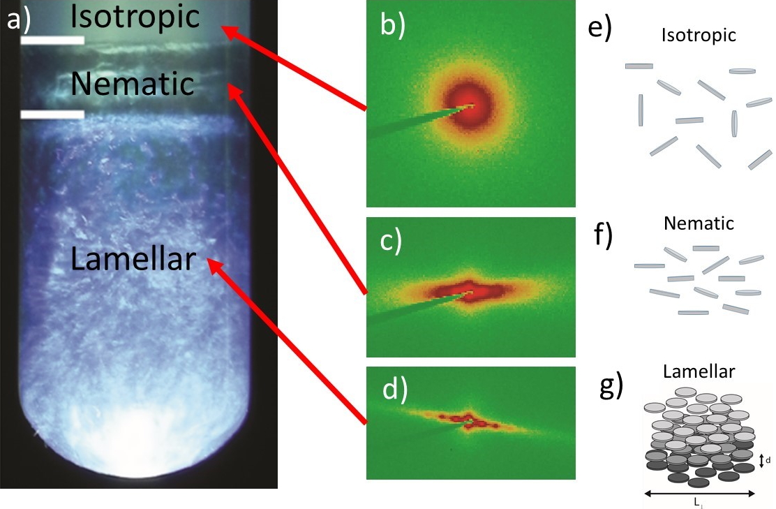 Figure: a) An aqueous suspension of H3Sb3P2O14 nanosheet in water in a test tube; showing the co-existence of the three phases (Isotropic, Nematic and lamellar), with their distinct scattering patterns (b,c, d) and schematic of their respective ordering (e, f, g).