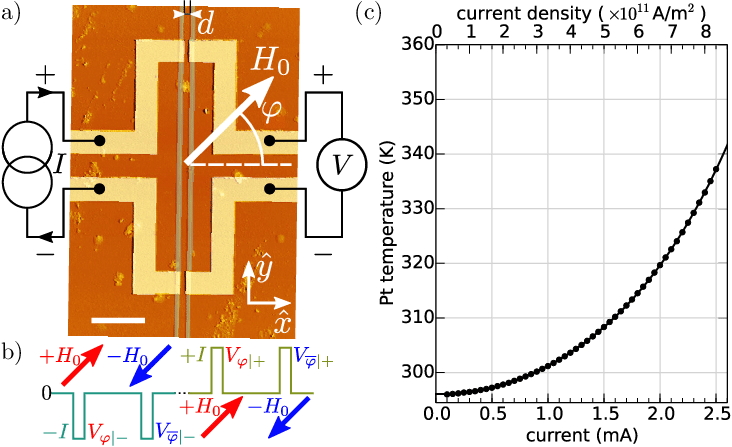 a) Top view of a lateral device. Two Pt wires (grey lines) are aligned along the y-direction and placed at a distance of d=1.2 µm apart on top of a 18~nm thick YIG film (scale bar is 5 μm). The non-local conductance I-V (injector-detector) is measured using current pulses while rotating the magnetic field Ho in-plane by an azimuthal angle Φ.