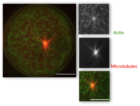 Example of reconstitution of a microtubule aster in a dense branched actin network (encapsulated Xenopus cell extracts). Scale bar: 10 µm