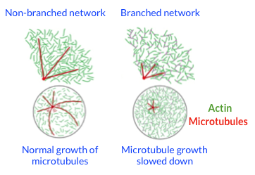 Schematic of the effect of actin filament branching meshwork on microtubule growth.