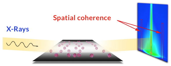 Figure 1. Synchrotron X-ray scattering at small angles in grazing incidence (GISAXS) that provides, on a two-dimensional detector, the Fourier transform (along a specific direction) of an assembly of nanoparticles (NP) on a substrate.