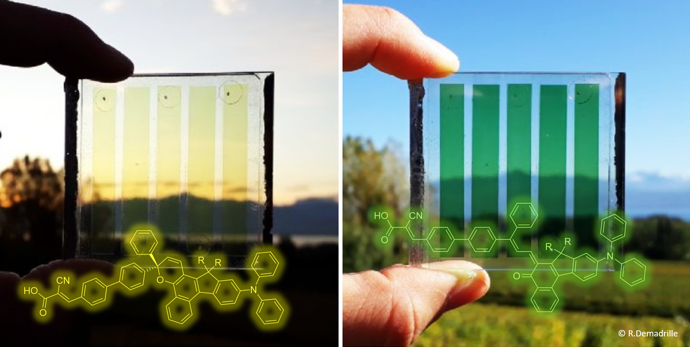 [2], the researchers thus integrated a photochromic unit into the structure of various dyes and were able to demonstrate that their photochromic behavior was preserved once integrated in the devices. Using these molecules, they have been able to manufacture and characterize solar cells and mini-modules that change color under light radiation from pale yellow to orange, red or dark green under high luminosity, increasing at the same time their photovoltaic conversion efficiency.