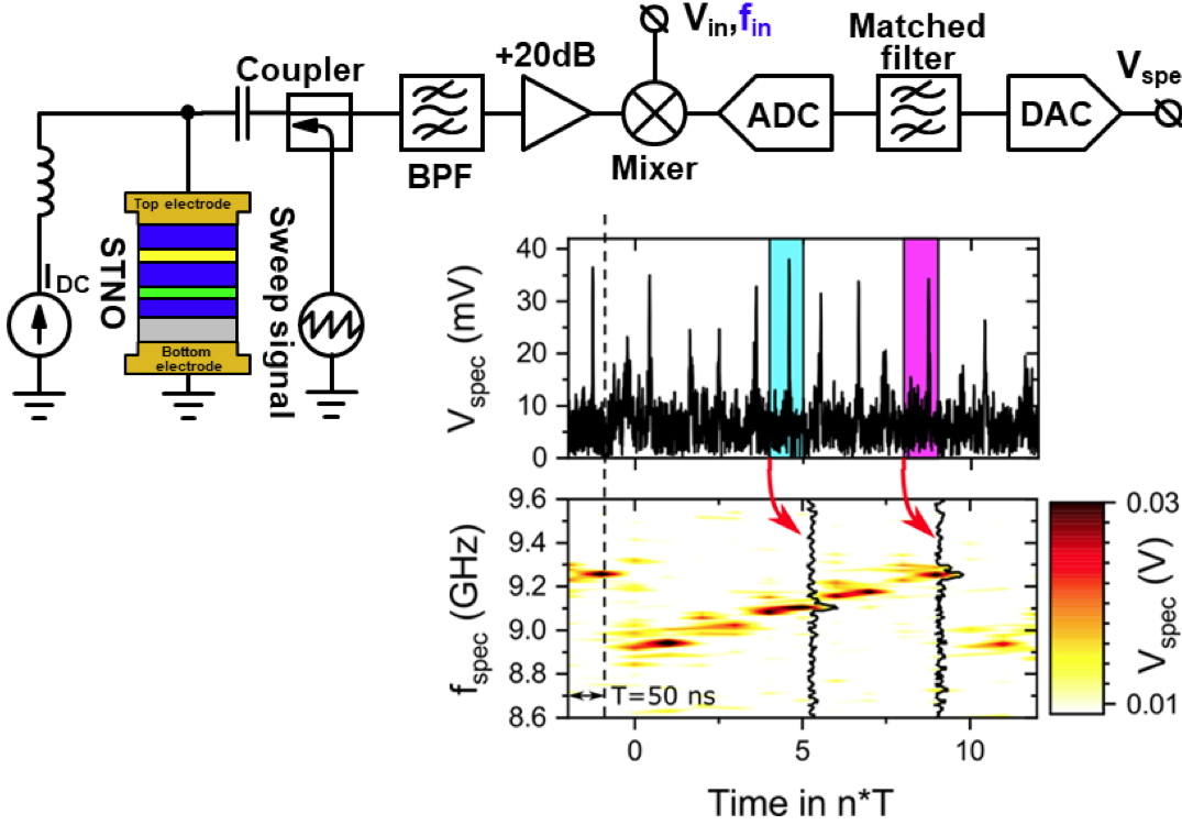 Due to the non-linear properties of the magnetization, the frequency of the STNO fSTNO can be swept over a certain range using a sawtooth signal VSW of period T. The modulated microwave signal is then mixed with the external signal Vin of unknown frequency. The mixed signal passes through a matched filter, inducing a narrow Vspec peak whose position in time to 0<to<T indicates the frequency of the signal Vin. The two graphs show an example where the STNO frequency is swept between 8.8 and 9.4 GHz and the frequency of the signal Vin varies in a sawtooth shape. Upper graph: Vspec peaks for 14 consecutive scan periods at T=50 ns. Bottom graph: representation, in the form of a frequency-time spectrogram, of the temporal evolution of the frequency for the 14 consecutive periods, showing that the spectrum analyzer based on a STNO can resolve and detect, on a 50 ns time-scale, the frequency variation of the external signal Vin.