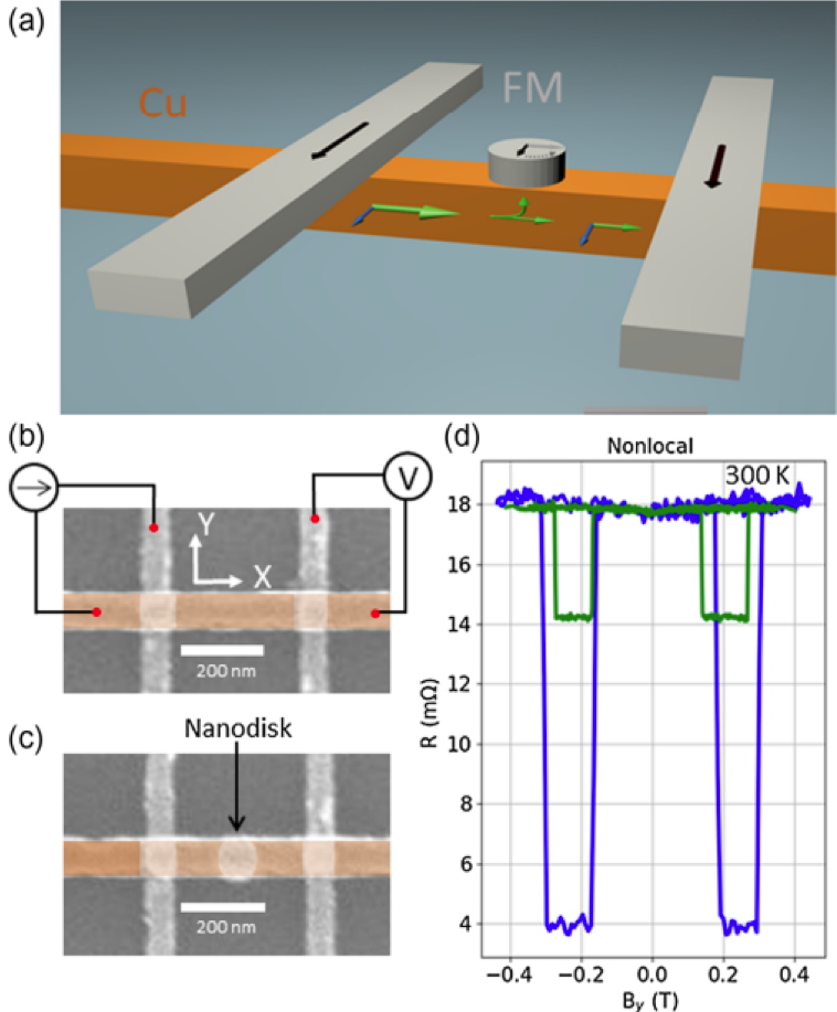 (a) Scheme of the device. The small disk above the orange wire is used to absorb the spins generated by the grey transverse wires representing ferromagnetic materials.