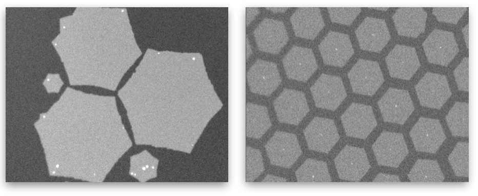 Figure 2: Radiation-mode optical microscopy of self-organised hexagonal graphene flakes on liquid copper (Image scale: ~1 mm).