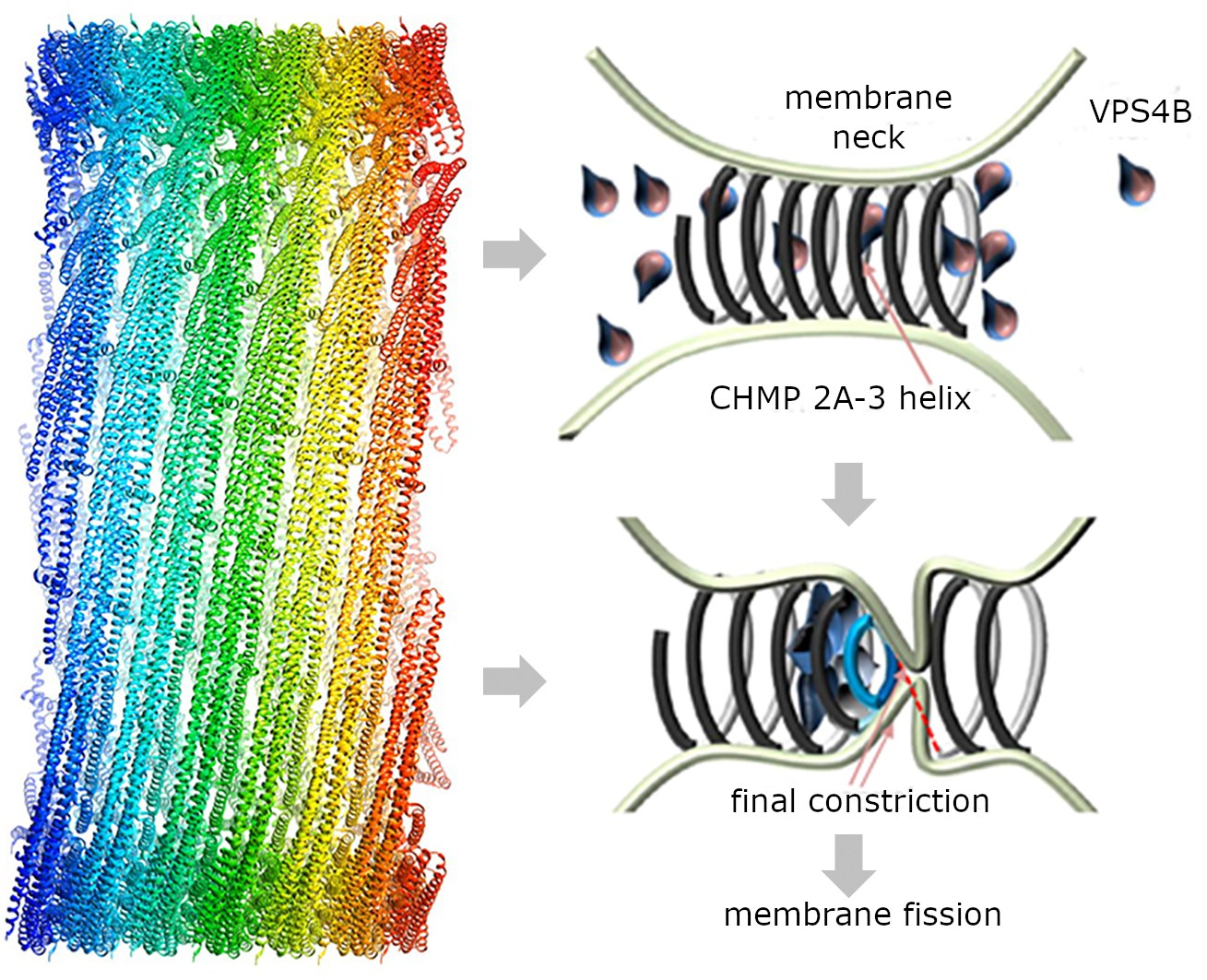 Figure: Model of membrane constriction by ESCRT-III. On the left, atomic model of ESCRT-III filaments composed of a heterodimer of CHMP2A and CHMP3. The outer surface of the filaments interacts with membranes in a manner similar to the topology of membrane collars as shown in the diagram (right). VPS4 tightens the filaments that can cleave membrane necks