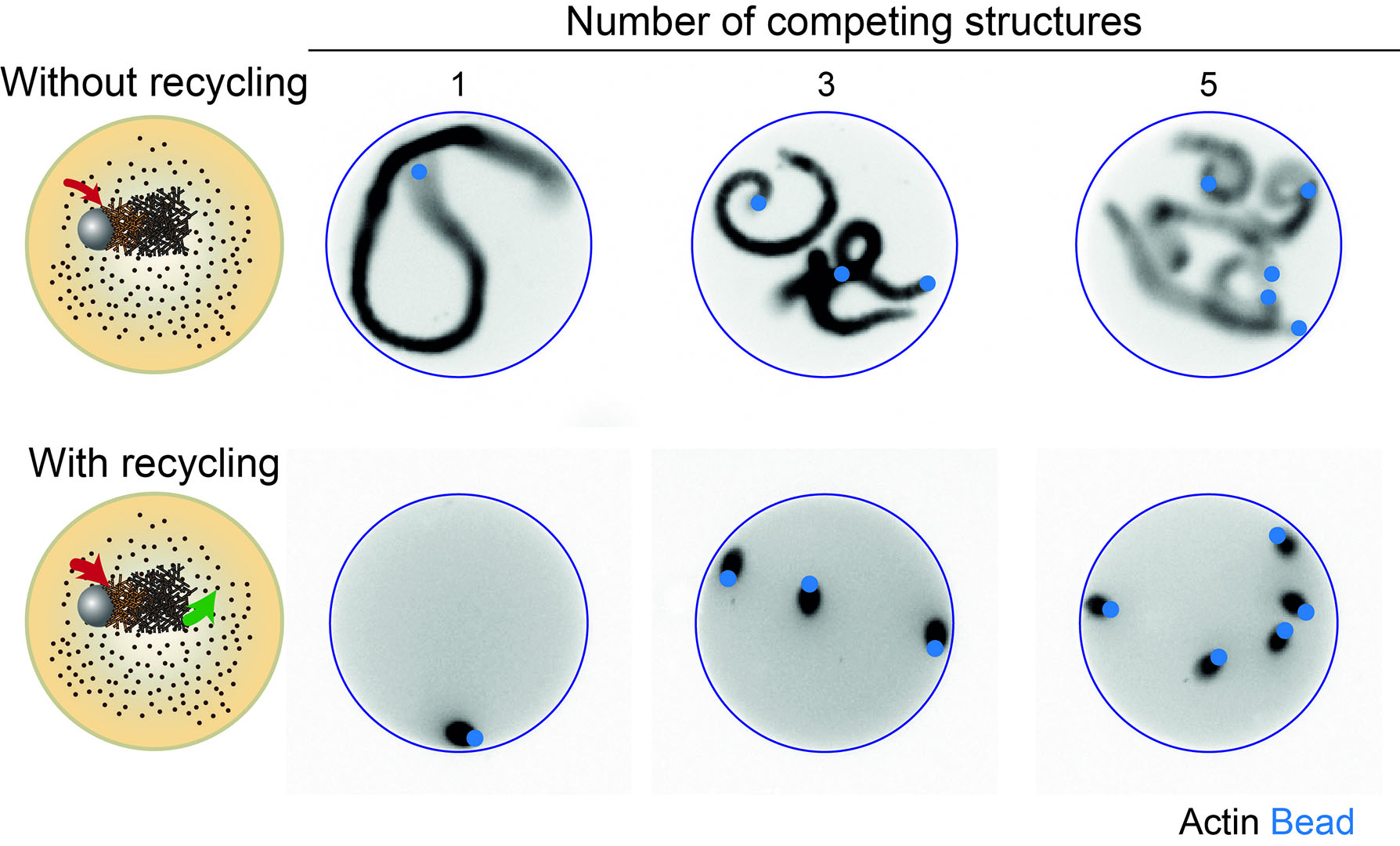 Authors of this study analyzed how resources are shared between different cell architectures. To do this, they reconstituted the competition between several actin networks using purified proteins, in order to grow these networks in micro-wells from small beads. This biomimetic system made it possible to control the number of competing networks, as well as the available quantity of resources (actin and associated proteins).