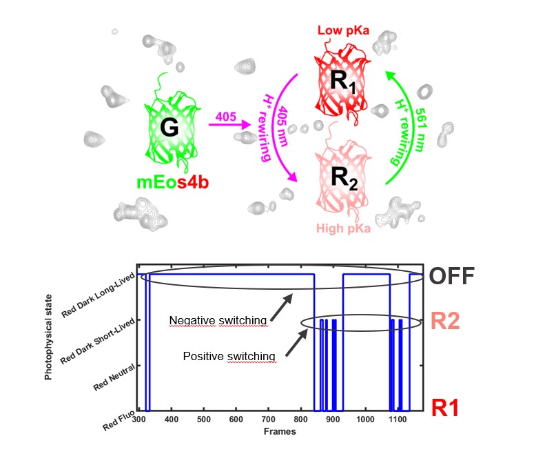 Top: mEos4b's positive photo-switching mechanism. Bottom, example of the evolution of the photo-physical state of a single mEos4b, molecule over time, showing transitions between the R1, R2 and OFF states. (D. Bourgeois / IBS)