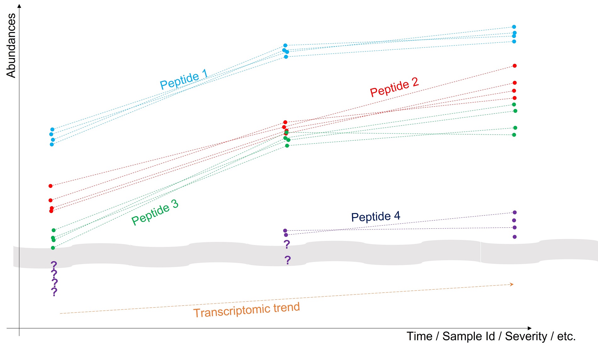 Figure: Toy example of how to leverage biomolecules’ correlations to improve missing value imputation: several peptides coming from the same protein (as well as possibly the transcript it was translated from) having measurement profiles that should be correlated. It is thus relevant to impute the missing values as to maximize it, as illustrated by the location of "?” For Peptide 4.