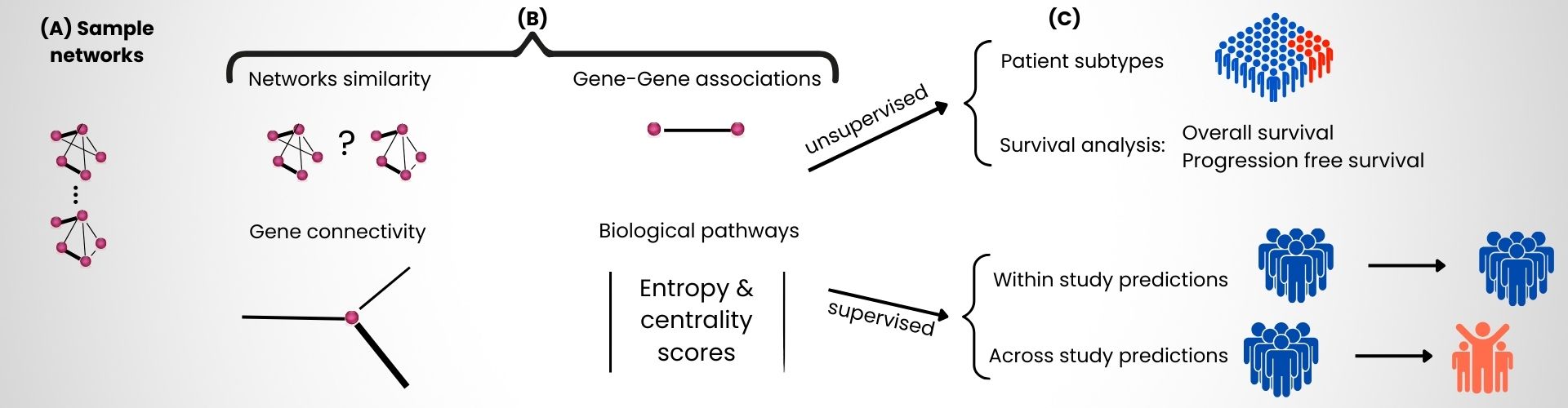 Figure: Overview of the in silico methodology: (A) patient-specific gene network modeling, (B) computation of four classes of topological features, and (C) evaluation for patient classification, survival analysis, and therapeutic response prediction. © CEA