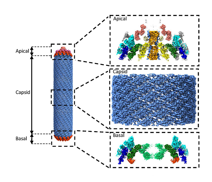 Structure of the whole nucleocapsid of AcMNPV obtained by cryo-EM. On the right, from top to bottom: zoom on a side view of the “apical” cap (the “entry point” for viral DNA), the capsid, and a side view of the “basal” structure.