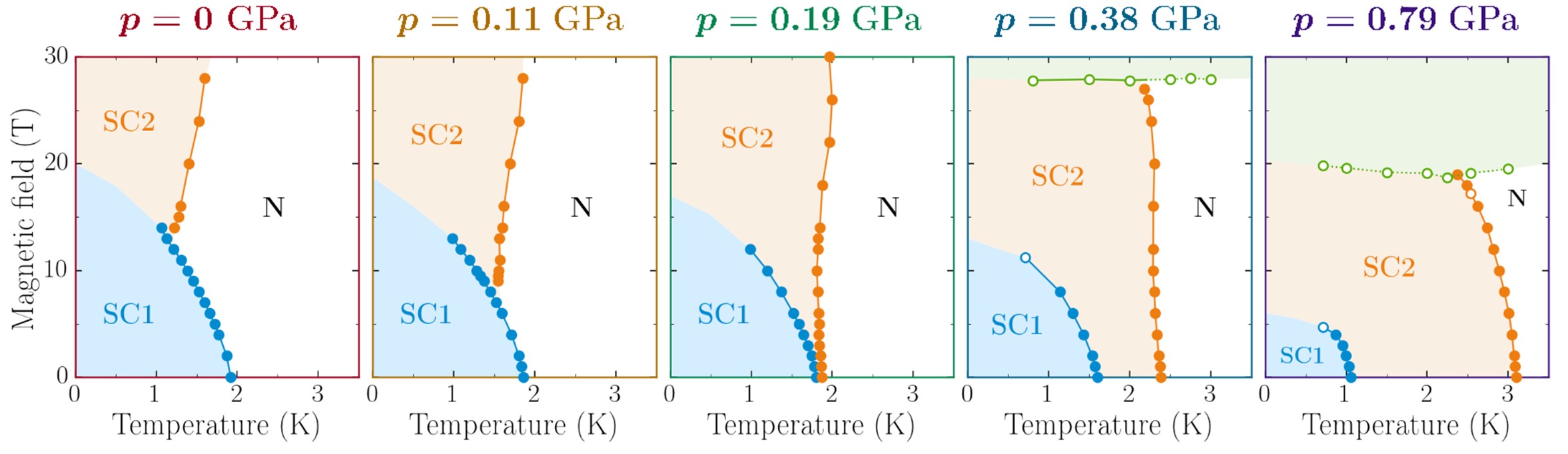 Figure 1. Since the discovery of its superconductivity in 2018, the researchers from around the world have been unveiling more and more of its astounding properties. When cooled to temperatures below 2 K, a first, single superconducting phase (SC1) appears. Surprisingly, a second superconducting phase is stabilised and reinforced when a strong magnetic field is applied to the sample. Finally, a third superconducting phase emerges under strong pressure (approximately 0.2 GPa, i.e. 2 000 times the atmospheric pressure). The researchers from