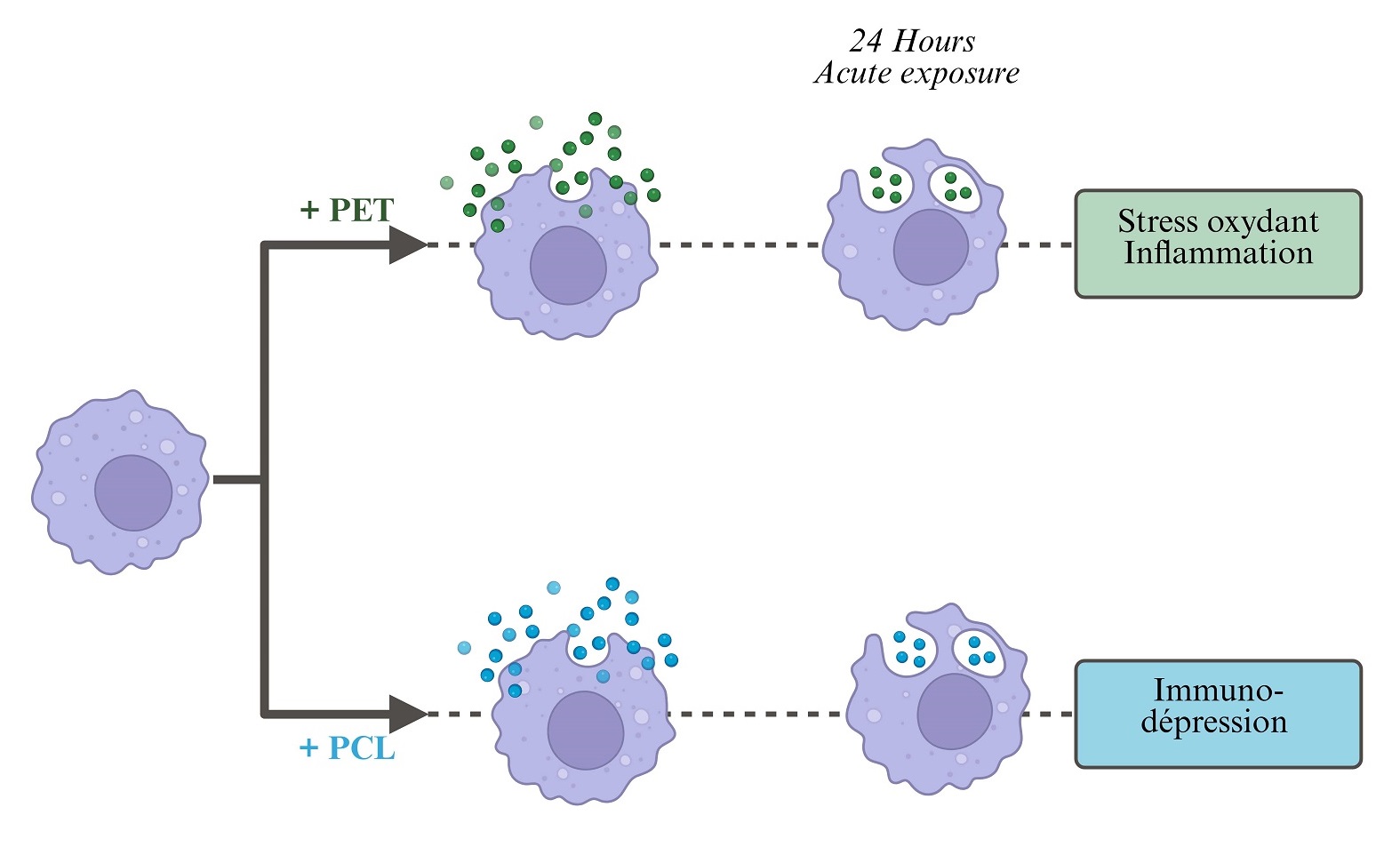 The researchers showed that these two particles induce very different effects in macrophages. PET particles induce cellular stress, in particular oxidative stress, and also induce a pro-inflammatory response in macrophages exposed to PET (see Figure). In addition, PET-exposed macrophages have a perturbed response to microorganisms, and would be less effective in their defensive role.