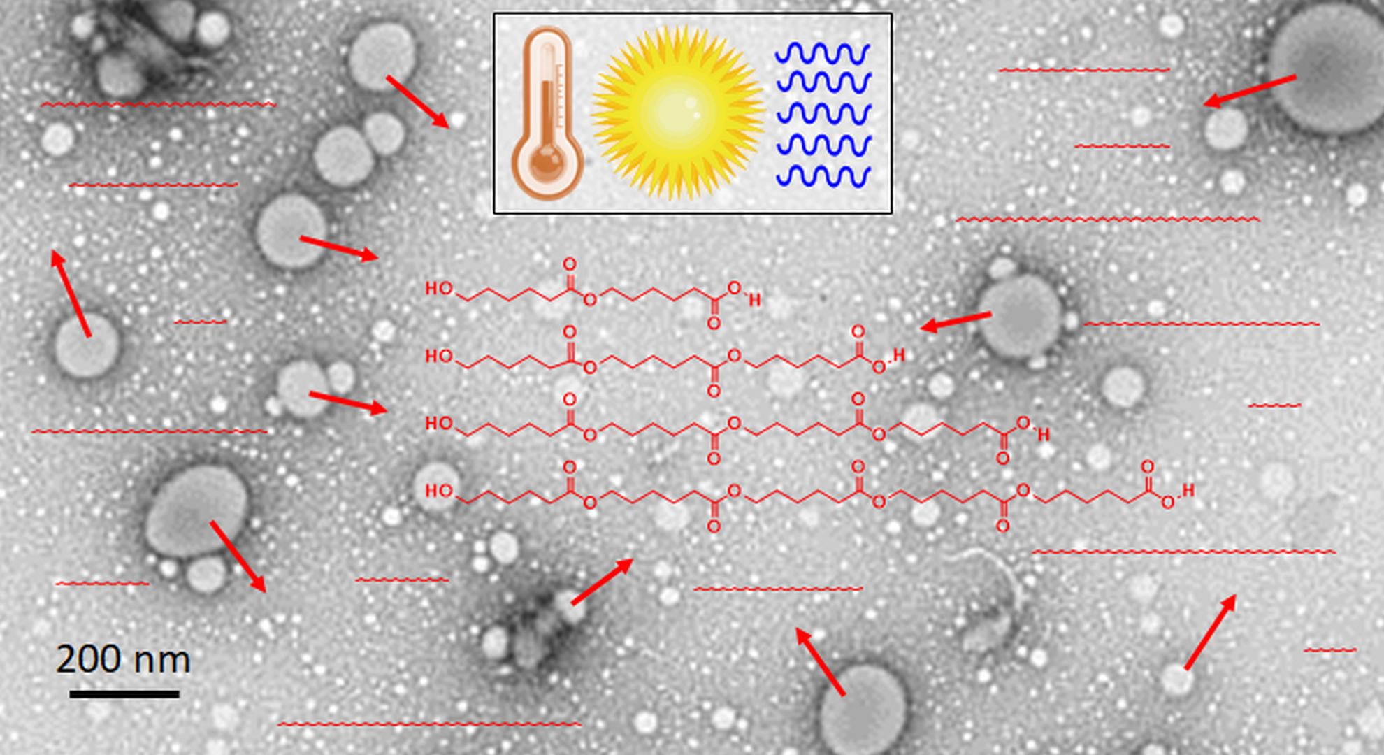 Under the combined action of heat, light and water, particles of biodegradable plastics release small soluble molecules, the oligomers.