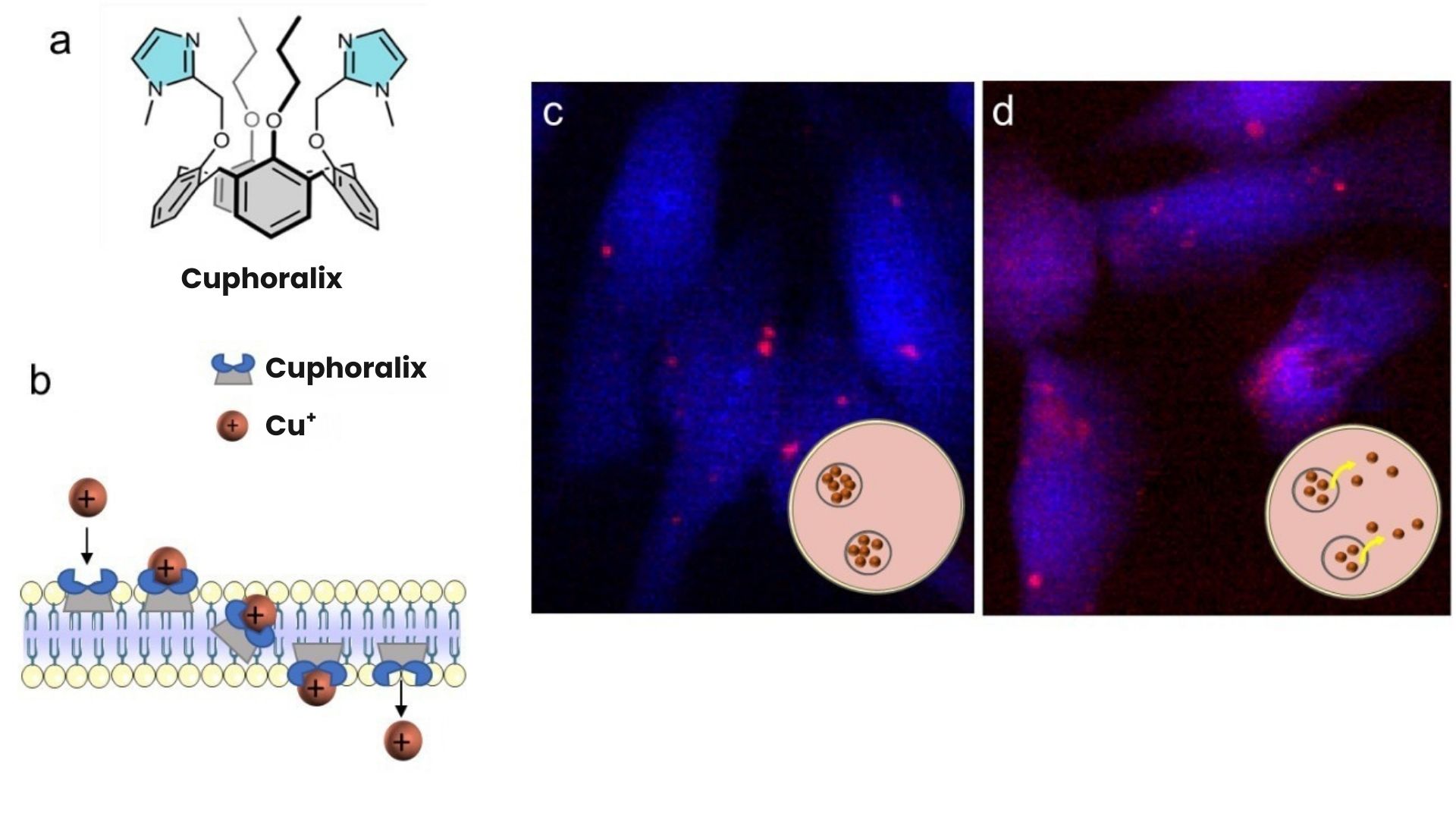 Figure: a) Structure of Cuphoralix. b) Mechanism of Cu+ ion transport across a lipid bilayer by Cuphoralix. c-d) X-ray fluorescence microscopy images showing the distribution of potassium (blue) and copper (red) in liver cancer cells exposed to 10 µM Cu (c) or 10 µM Cu and 100 nM Cuphoralix (d).
