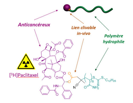 Pro-drogue : paclitaxel tritié (violet) lié à un polymère hydrophile (vert) via un lien clivable in vivo (orange) © UPSay