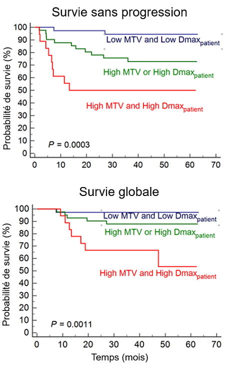 L'approche proposée consiste à détecter automatiquement les foyers tumoraux à partir d'images TEP au 18F-FDG (fluorodésoxyglucose) corps entier, puis à calculer des index décrivant la répartition des foyers détectés, tels que la plus grande distance entre deux foyers. L'intérêt de cette analyse quantitative a été évalué sur une cohorte de 95 patients traités pour un lymphome de type B à un stade avancé. Les résultats obtenus par l'équipe montrent que, chez ces patients, l'index calculé de dissémination tumorale est très significativement corrélé à la survie sans progression et à la survie globale des patients. En combinant cet index au volume tumoral total, il est possible de stratifier les patients et de prédire leur survie (Figure). Les atouts de ce nouveau biomarqueur d'imagerie résident dans la simplicité de son calcul à partir d'images TEP au 18F-FDG ainsi que dans son interprétation extrêmement aisée.