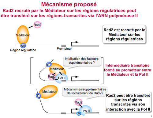 Dans cette étude, l'équipe a mis en évidence la dynamique fonctionnelle des 3 protagonistes en utilisant des approches génomiques et génétiques. Ce travail a permis de proposer un mécanisme selon lequel des interactions dynamiques avec le Médiateur et l'ARN polymérase II sont impliquées dans le recrutement de la protéine Rad2 sur la chromatine (structure au sein de laquelle l'ADN se trouve compacté).